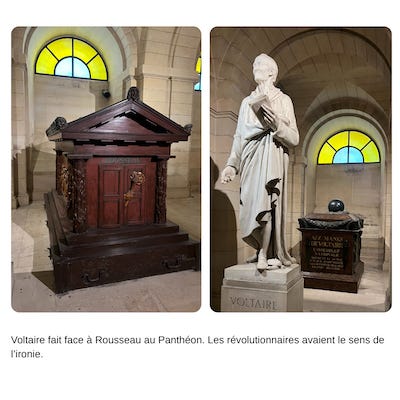Cette période du “Roi-Nation” ne va pas durer. Les Lumières et la Révolution vont donner une nouvelle dimension à l’unité nationale. Elle est désormais celle des citoyens portée par un idéal universel où chacun devient son propre maître. Elle puise la source de son fonctionnement dans la philosophie des Lumières, Voltaire et Rousseau en tête, bien vite Panthéonisés (face à face .. hihi).