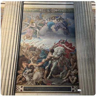 Le roman national célèbre à la fois les Francs et les Gaulois. Ainsi, au Panthéon, le roi franc Clovis, peint par Joseph Blanc, est coiffé d’un casque ailé… typiquement gaulois.