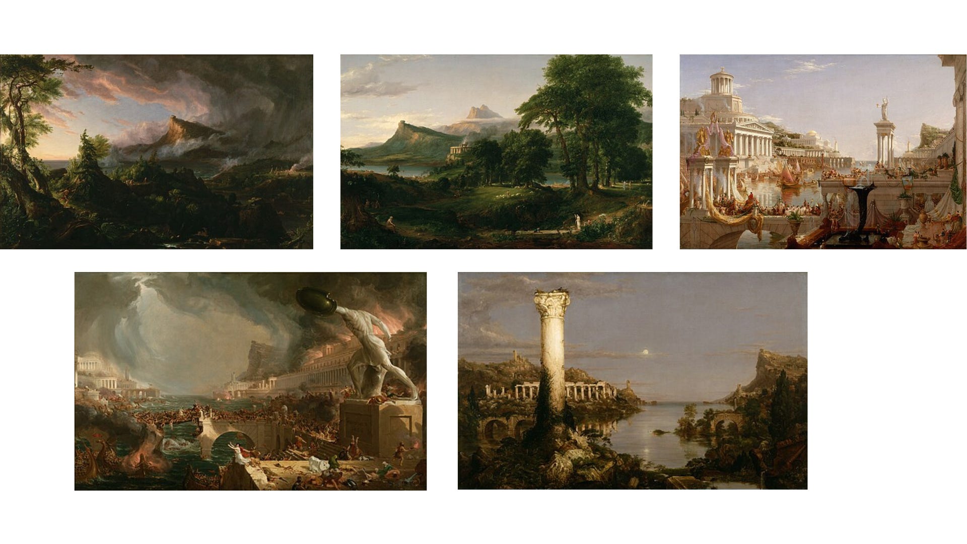 L’artiste Thomas Cole peint entre 1833 et 1836 une série de cinq tableaux illustrant la naissance, l’apogée et l’inévitable déclin d’un empire. Il nous plonge d’abord au cœur d’un environnement à l’état sauvage où l’homme, sans doute nomade, est encore peu présent. Puis il représente dans une seconde œuvre l’harmonie entre les premiers habitants sédentaires et la nature. Ensuite, le petit village se transforme en une ville magnifique, digne de la Rome antique, fourmillante de vie avant d’être saccagée par ce qu’on devine être des barbares. Détruite, la ville laisse sa place à la désolation, si proche de l’état sauvage du premier tableau. Thomas Cole nous raconte l’histoire d’un empire. On peut aussi y voir la grandeur et la déclin d’une civilisation.