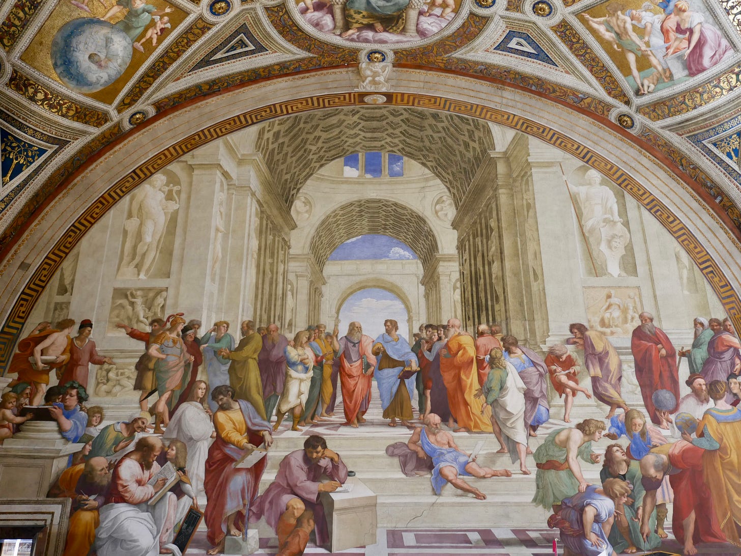 Dâabord lâhĂ©ritage grec. Au centre, nous retrouvons Platon dĂ©battant avec son Ă©lĂšve Aristote. Le premier pointe le ciel et lâidĂ©al, le second le sol et la rĂ©alitĂ© des contraintes qui nous entourent. Ă gauche, Alexandre le Grand en armure discute avec un Socrate en tunique verte. Dans le coin infĂ©rieur, nous retrouvons Pythagore et en face Ă droite, Euclide qui manie le compas. PtolĂ©mĂ©e, lâun des pĂšres antiques de lâastronomie, porte son globe terrestre, discutant avec Zoroastre sous lâĆil malicieux du jeune RaphaĂ«l (25 ans au moment de la crĂ©ation de ce tableau) qui sâest incrustĂ© lui-mĂȘme dans la composition. HĂ©raclite, mĂ©lancolique, semble atteint du syndrome de la page blanche tandis que DiogĂšne est nonchalamment allongĂ© sur les escaliers.